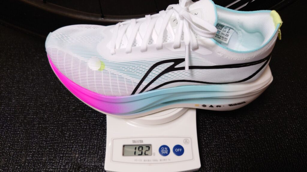 実測で192gでしたが、日本国内で売られているシューズの26.5cm相当の大きさだと思われますので、日本国内で販売されているシューズの中でも軽量と考えています。