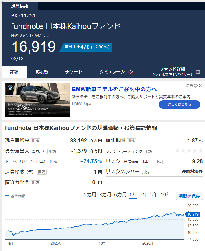 fundnote 日本株kaihouファンドに関しては設立から1年経った現在は好調ですが、このまま好調が続くとは限りません。